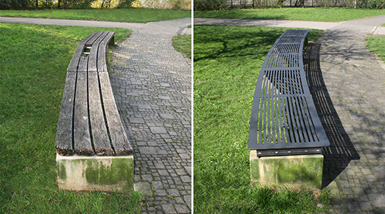 Bei den gezeigten Banksitzflächen aus Stahl hingegen kann man – bei der hochwertigen Qualität und Verarbeitung der Firma hygro care® – davon ausgehen, dass das Sitzvergnügen sehr lange anhält, dass kein vermoostes und vergammeltes Holz die Kleidung verunreinigt oder gar Splitter schmerzhaft zu spüren sind. Zudem sind die gezeigten Sitzflächen sehr stabil, weitgehend selbstreinigend und vandalismusresistent sowie recyclebar.